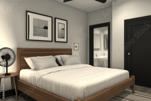 Fototapeta premium Modern bedroom interior design with king-size bed, wooden frame, and minimalist decor.