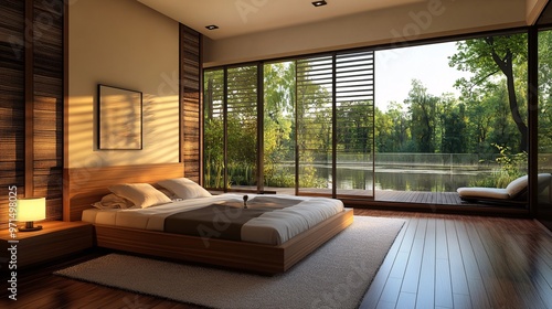 © Beer AI, Naklejka premium Modern Bedroom with Large Windows and View of Lake