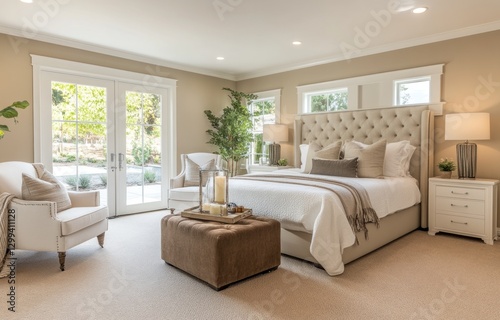 © minang, Fototapeta premium Modern bedroom with patio view. Possible use Interior design photography