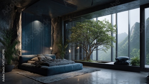 © andrew, Fototapeta premium Modern Bedroom with Stone Walls and Panoramic View of Mountain Landscape