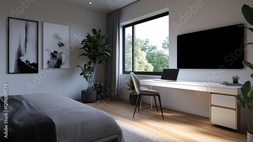 © DesignByGade, Fototapeta premium Modern bedroom with workspace, featuring minimalist design elements.