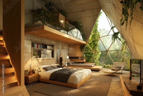 Naklejka premium Modern bedroom, wood, plants, glass, loft, forest view.