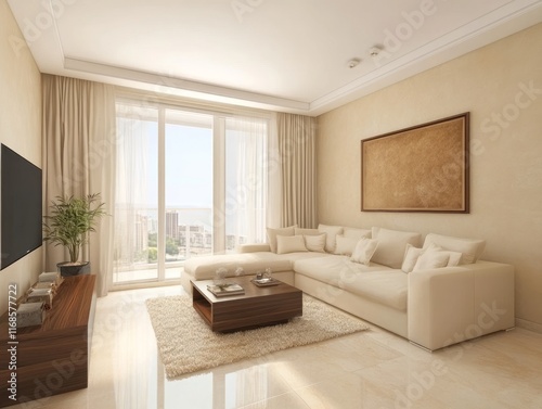 © Chand Abdurrafy, Fototapeta premium Modern Beige Living Room With City View