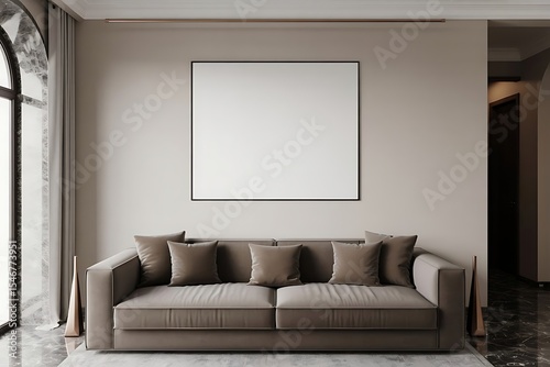 © Senu2282, Fototapeta premium Modern beige living room with large blank canvas and sofa