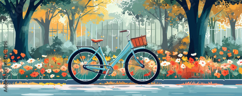 Obraz premium Modern bicycle parked near a flower-filled park. Vector flat minimalistic...