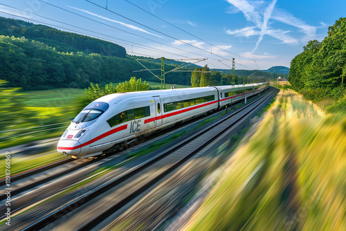 © Oleksandr, Fototapeta premium Modern big high-speed train in fast motion passes through railway stations, abstract vivid composition consists of fictional unreal fantastic vision on background