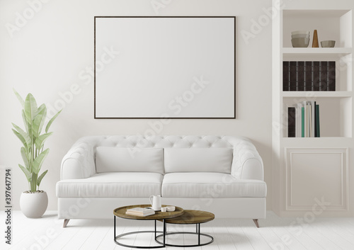 © Thanet, Fototapeta premium modern big living room with wooden floor, white wall, mock up frame, art deco style. - 3d rendering -