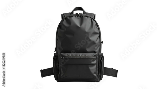 Naklejka premium Modern black backpack, front view, isolated on a dark background