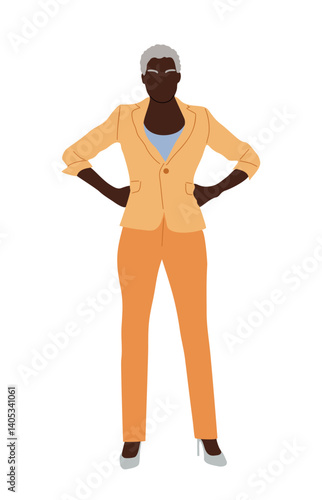 Fototapeta premium Modern black businesswoman standing in confident pose. Vector illustration of cartoon african american business woman in smart casual outfit, orange suit. Isolated on white background.