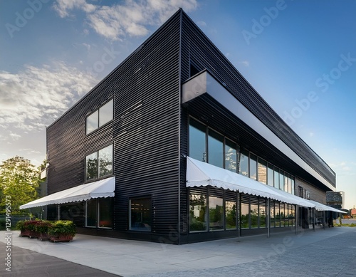 Fototapeta premium modern black commercial building with large windows and white awnings ideal for retail restaurant or office space