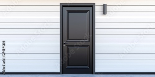 © trustmastertx, Fototapeta premium Modern black door on white siding exterior.