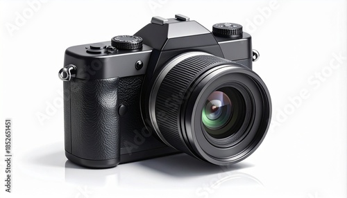 © JeremyLawrence, Fototapeta premium Modern black DSLR camera with large lens on light surface