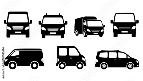 Fototapeta premium Modern Black Filled Van Vector Icon Set – 7 Minimal Flat Transportation Icons
