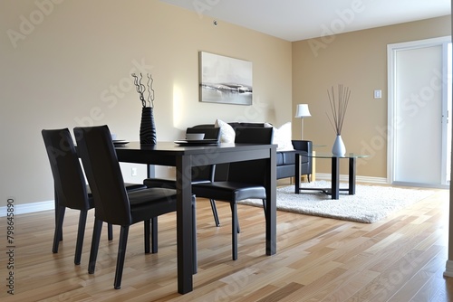 © Michael, Fototapeta premium Modern Black Furniture Dining Room with Wooden Floor Panorama
