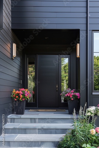 Fototapeta premium Modern black home entrance with minimalist style and vibrant floral accents