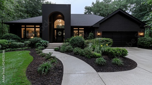 Naklejka premium Modern black house, landscaped yard, evening light, suburban setting, real estate listing