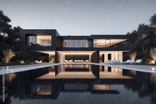 © jejakaryastudio, Obraz premium Modern black house with infinity pool at twilight.