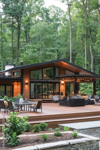 © Ilja, Naklejka premium Modern black loft house with steel frame pavilion, glass doors, and scenic nature view