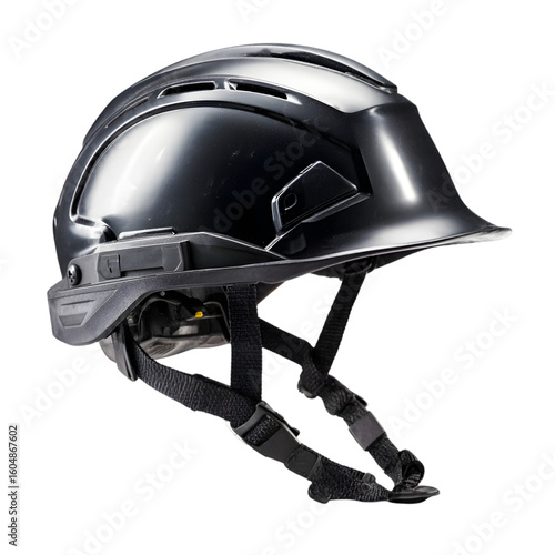Fototapeta premium Modern black safety helmet with adjustable chin strap and ventilation slots isolated on transparent background