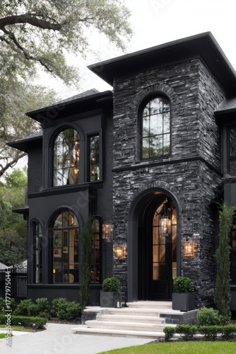 Naklejka premium Modern black stone house with elegant architecture and lush greenery in a peaceful suburban neighborhood during the afternoon