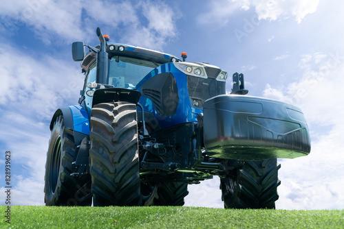 Fototapeta premium Modern blue agricultural tractor on a background of blue sky.