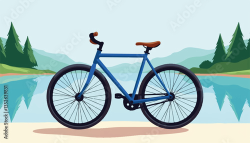 Naklejka premium Modern blue bicycle by serene lake, harmony with nature