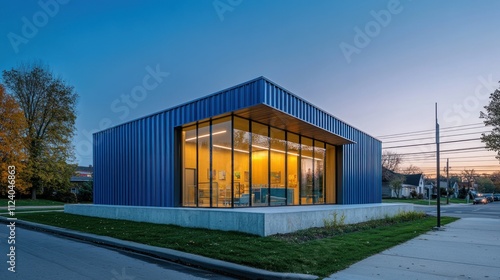 © mas, Fototapeta premium Modern blue building with large glass windows at dusk.