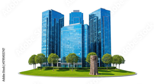 © Gennyson Marinho, Obraz premium Modern blue glass skyscraper buildings surrounded by lush green trees and grass isolated on transparent background
