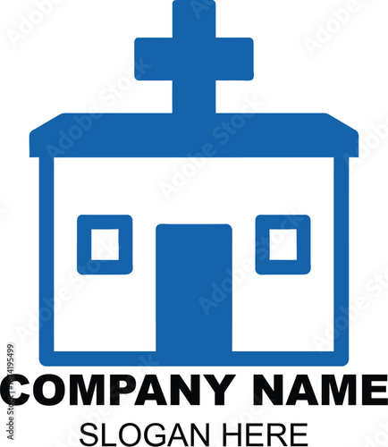 © Jashim, Obraz premium Modern Blue Hospital Building with Cross Symbol Logo Design