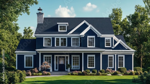 © Yuka, Obraz premium Modern blue house with landscaped garden under a clear sky, showcasing vibrant greenery