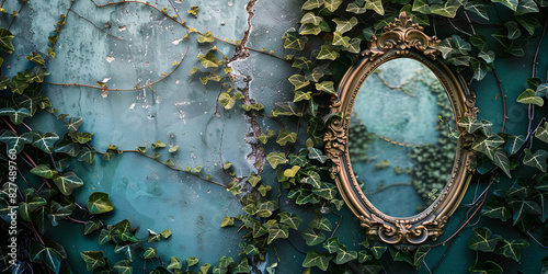 © Sana, Obraz premium Modern Blue Wall with Glass Framed Leafy Wallpaper