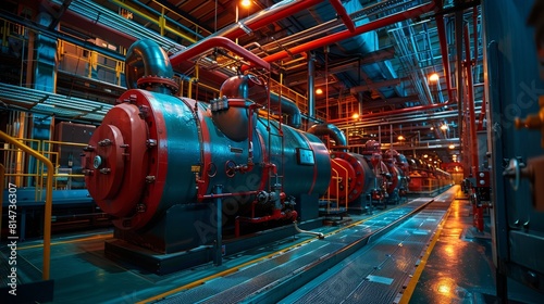 Obraz premium Modern boiler room with red and blue pressure tanks.