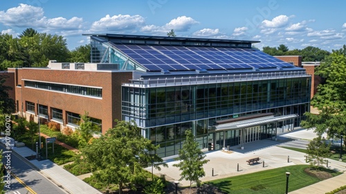Obraz premium Modern Brick and Glass Building with Solar Panels on Roof.