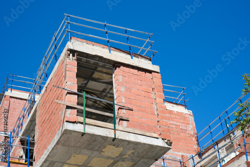 © Kepler, Obraz premium Modern brick building construction against clear blue sky in urban development