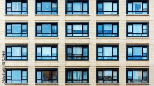 © wiwat apisithpinyo, Fototapeta premium Modern Brick Building Facade with Black Windows