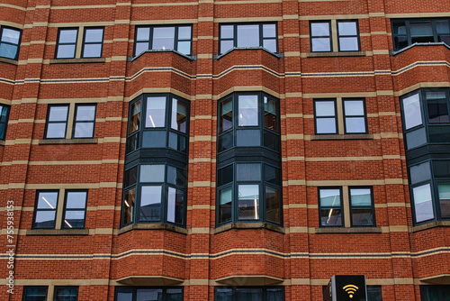 © iSky Media, Fototapeta premium Modern brick building facade with patterned windows and architectural details in Leeds, UK.