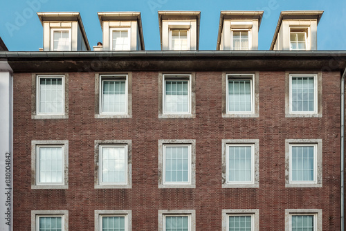 © Peeradontax, Fototapeta premium Modern Brick Building Facade with Windows and Dormers
