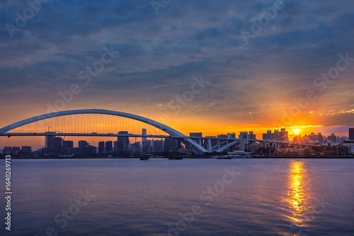 Obraz premium Modern bridge and city skyline at sunset in Shanghai.