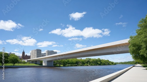 Naklejka premium Modern Bridge Over Calm River Under Clear Blue Sky Surrounded by Lush Green Trees and Scenic Urban Landscape