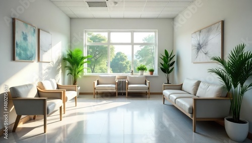 Fototapeta premium Modern, bright doctor's surgery waiting area with comfortable seating and natural light , healthcare, appointment, medical