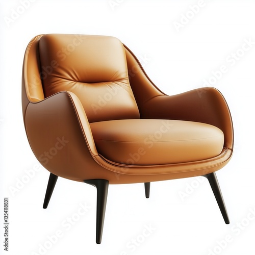 © XT Dabro, Naklejka premium Modern brown leather armchair with curved ergonomic design, plush cushioned seat, and black wooden legs, luxury interior decor furniture isolated on white background