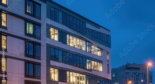 © mdshafiq, Fototapeta premium Modern building at dusk representing urban development and architecture, featuring illuminated windows