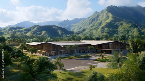 Naklejka premium Modern Building Design Surrounded by Lush Green Mountains