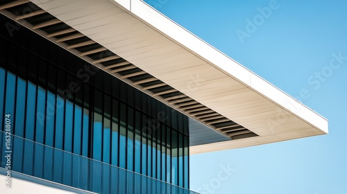 Obraz premium Modern building detail glass facade, white overhang, blue sky.