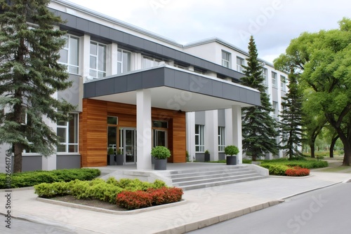 © kardaska, Fototapeta premium Modern building entrance with landscaped green trees