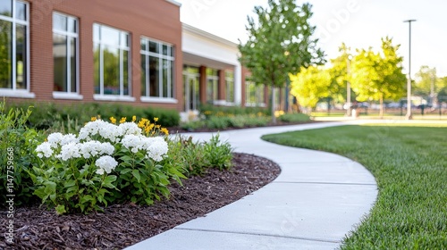 © kinara art design, Obraz premium Modern building exterior with landscaped walkway and flowers.