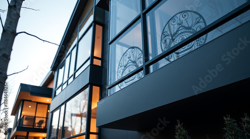 Fototapeta premium Modern Building Exterior with Large Windows and Exterior Lighting