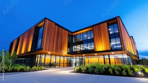 © Natalia, Fototapeta premium Modern building facade featuring Mocha Mousse cladding with black-framed windows and lush landscaping under a bright blue sky
