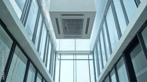 Obraz premium Modern building interior, ceiling unit, glass walls, bright sky.