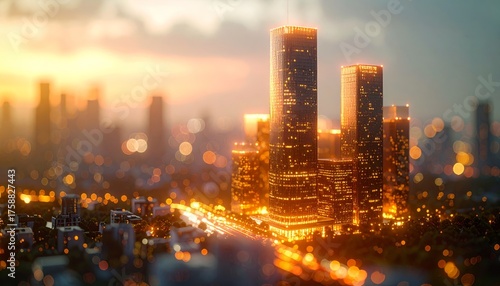 © Stefan Schurr, Fototapeta premium Modern building reflecting light at dusk. Abstract Futuristic Business Background